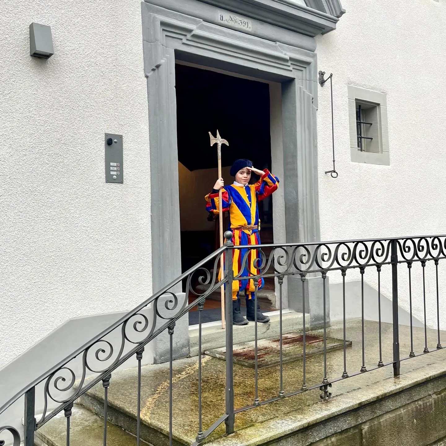 Ein täuschend echter Hellebardier kam vorbei und stand Ehrenwache an der Klosterpforte. — Weiter...
